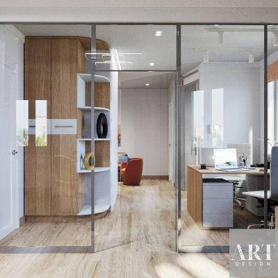 Dieses Notariatsbüro, entworfen von der Modern Design Studio, vereint stilvolle Ästhetik, Funktionalität und Privatsphäre und ist damit eine ausgezeichnete Wahl für Unternehmen, die juristische Dienstleistungen anbieten. Die einzigartige Raumaufteilung wurde mit dem Fokus auf den Komfort und die Effizienz der Arbeit des Notars und seines Teams entwickelt und gewährleistet eine optimale Organisation der Arbeitsabläufe.
