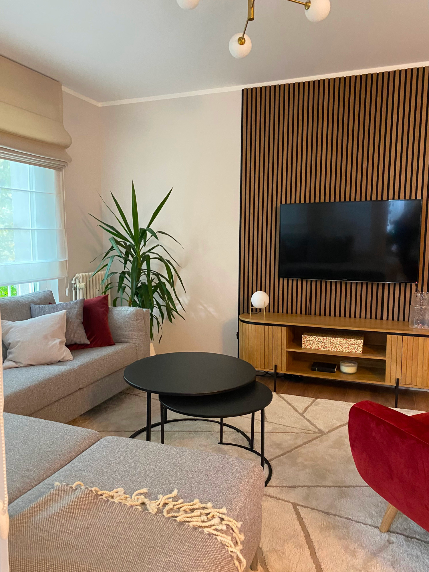 Ein besonderes Element im Interieur ist der bordeauxrote Sessel, den die Kundin aus den vorgeschlagenen Optionen ausgewählt hat. Dieser Sessel setzt nicht nur einen lebendigen Akzent im Raum, sondern ist auch zum Lieblingsplatz für entspannte Fernsehabende geworden.