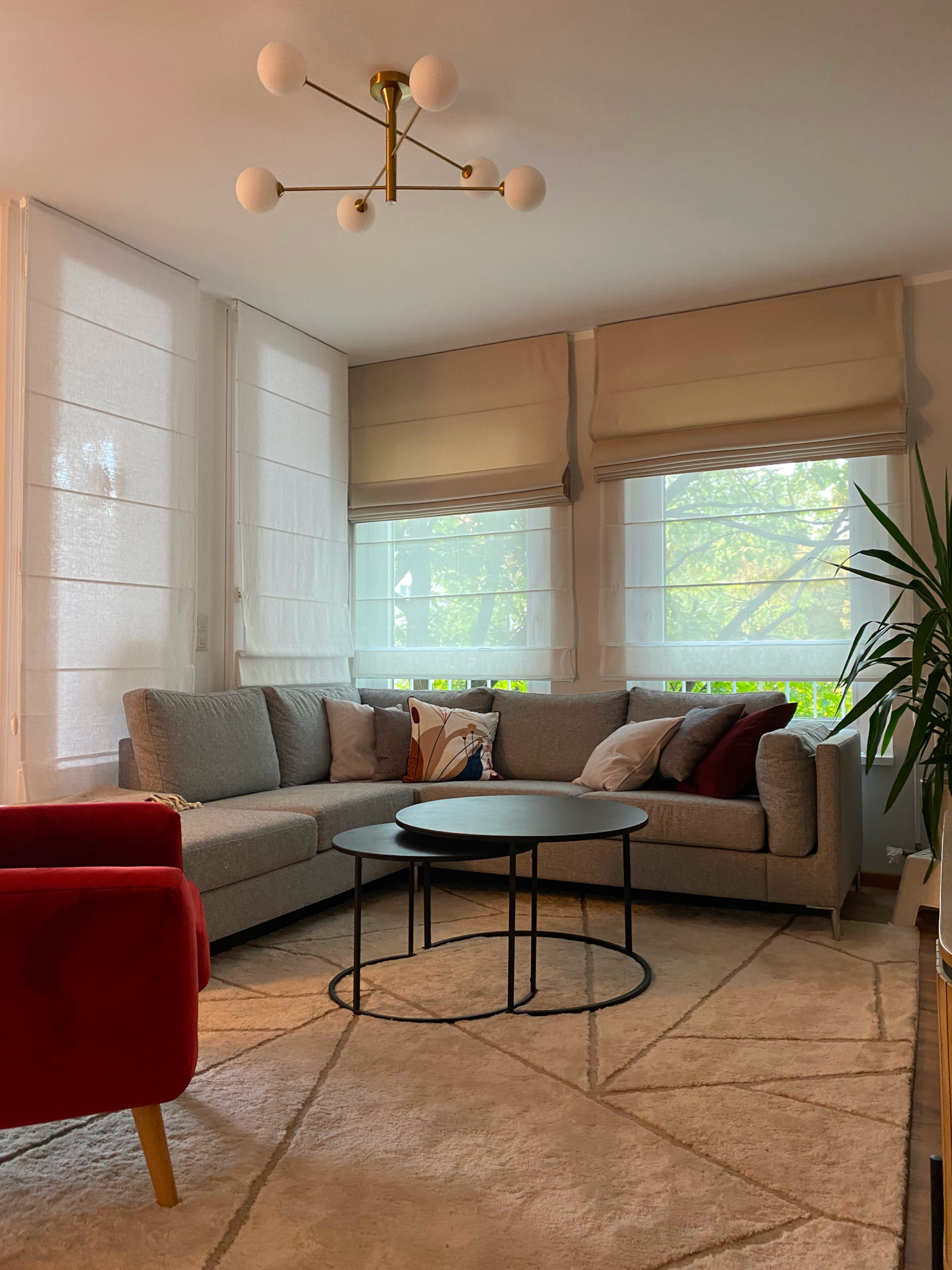 Wir installierten doppelte römische Rollos, bestehend aus einem dünnen Stoff für den täglichen Gebrauch und einem dichten Stoff zum Schutz vor Sonnenlicht an heißen Tagen. Diese Lösung bietet Flexibilität bei der Lichtregulierung und schafft zu jeder Tageszeit eine angenehme Atmosphäre.