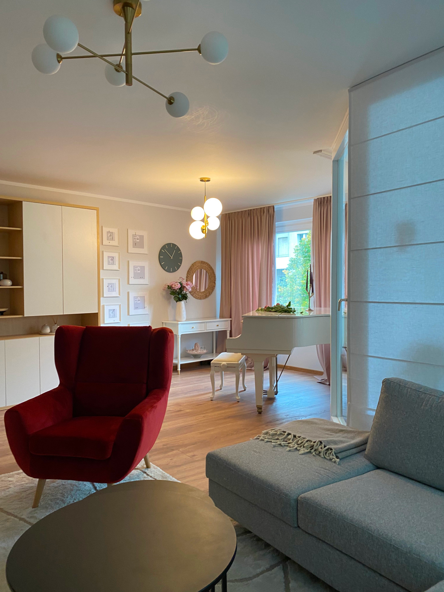 Wir gestalteten ein geräumiges Wohnzimmer mit einem bequemen Sofa, ideal für den Empfang von Kindern und Enkeln. Besonderes Augenmerk legten wir auf die Schaffung eines separaten Kreativbereichs, in dem das Klavier als zentrales Element die musikalischen Interessen der Bewohnerin unterstreicht.