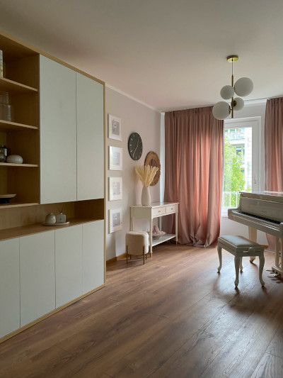 Ich präsentiere ein Projekt, das für eine alleinstehende Frau entwickelt wurde, die leidenschaftlich Musik liebt und virtuos Klavier spielt. Unser Ziel war es, einen gemütlichen und funktionalen Raum zu schaffen, der ihre Individualität widerspiegelt und Komfort für Familientreffen bietet.