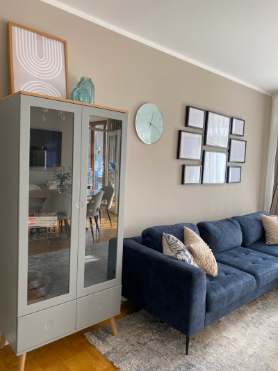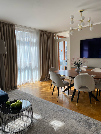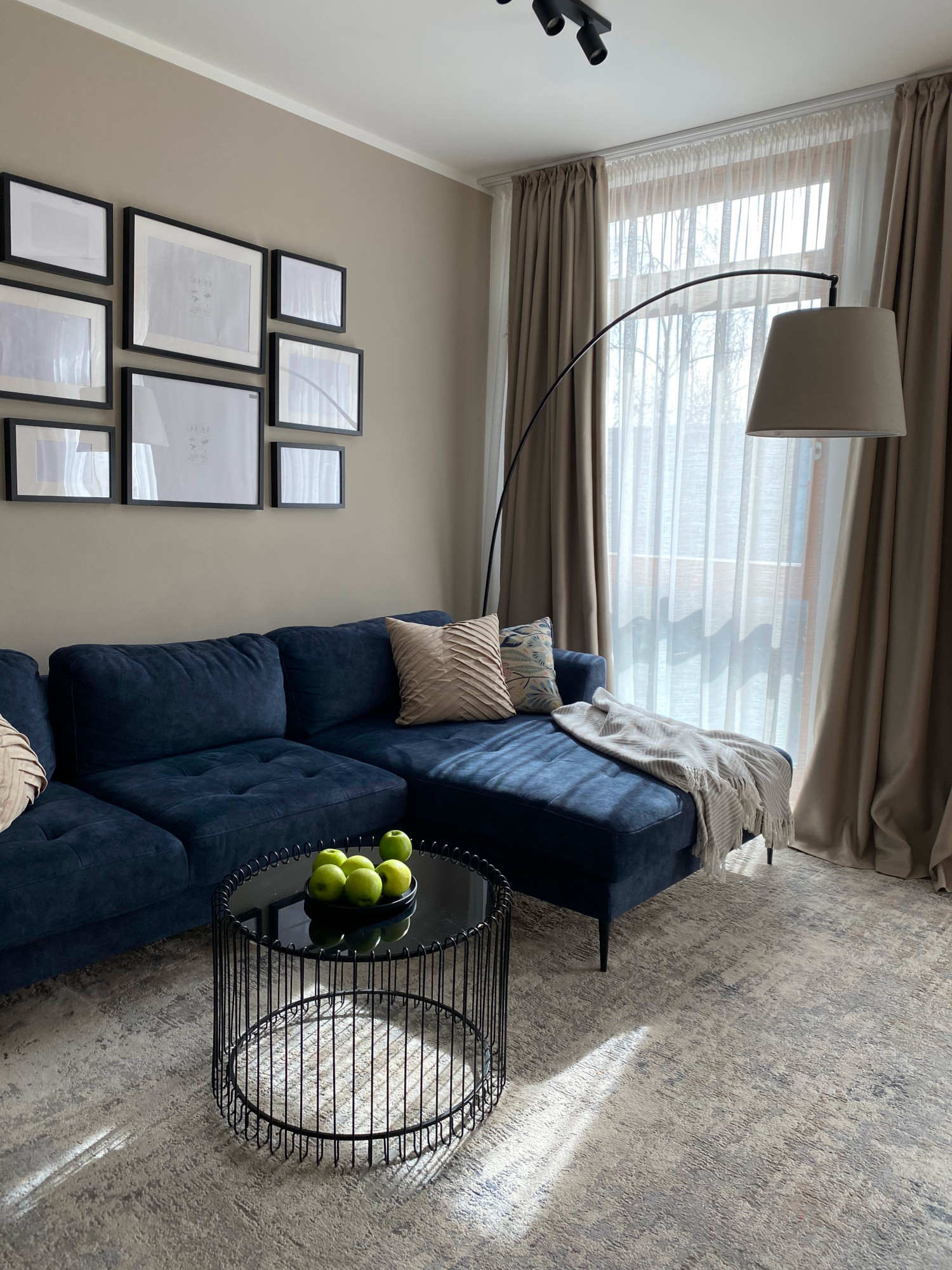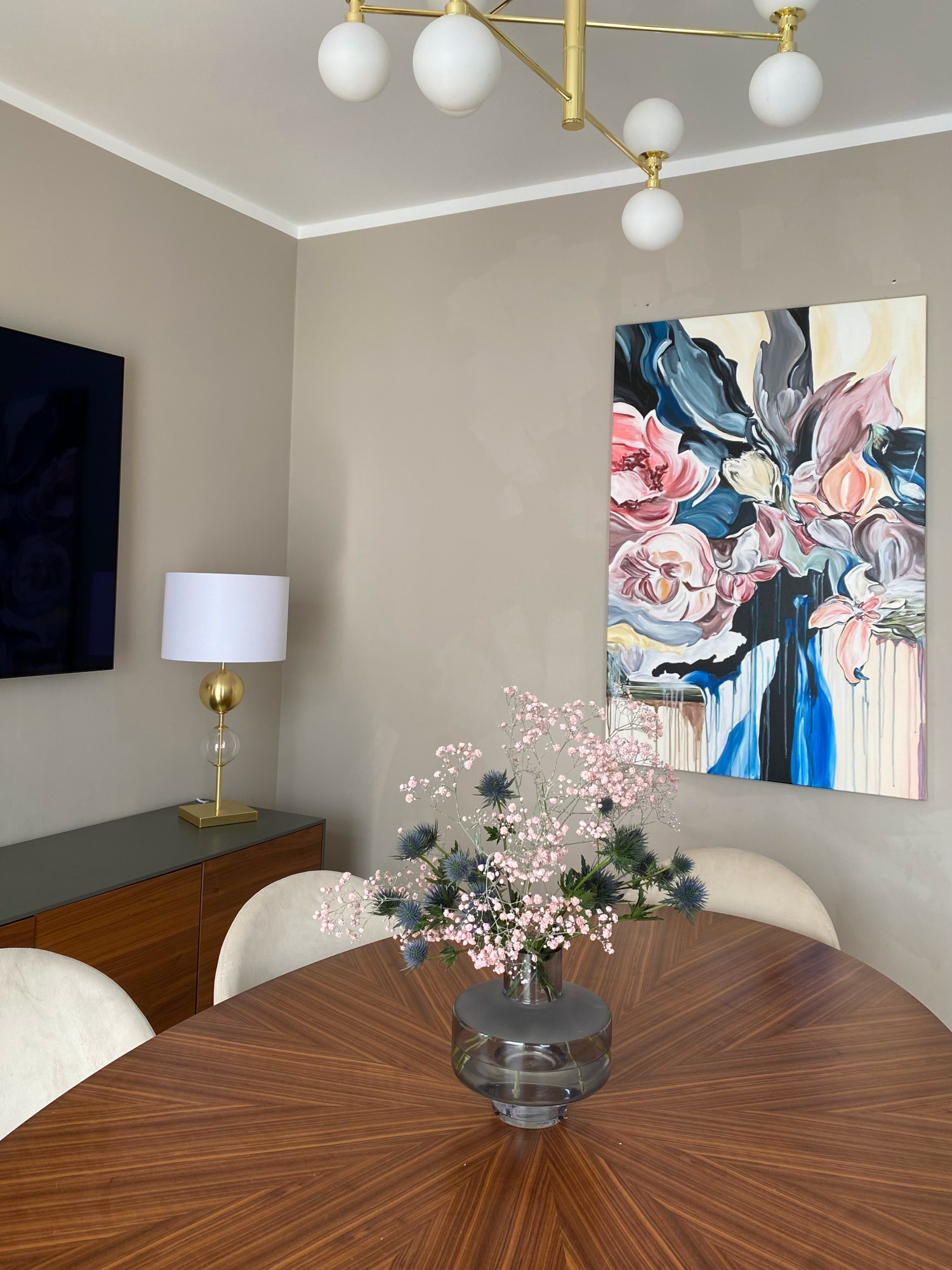 Im Wohnzimmer platzierten wir einen großen Esstisch, der zum Mittelpunkt für Familienessen und Feiern wurde. Daneben stellten wir ein Geschirrbufett auf, um praktischen Stauraum für Geschirr zu bieten. Trotz dieser Ergänzungen blieb ausreichend Platz für eine gemütliche Fernsehecke für die ganze Familie. Ein besonderes Highlight des Raumes ist ein Gemälde, das von einer Künstlerin aus der Ukraine angefertigt wurde und die Harmonie des gesamten Raumes bestimmt. Maßgeschneiderte, schöne Vorhänge vervollständigen das Bild und machen das Wohnzimmer zum Anziehungspunkt für alle Familienmitglieder und zum Stolz der Hausherrin.